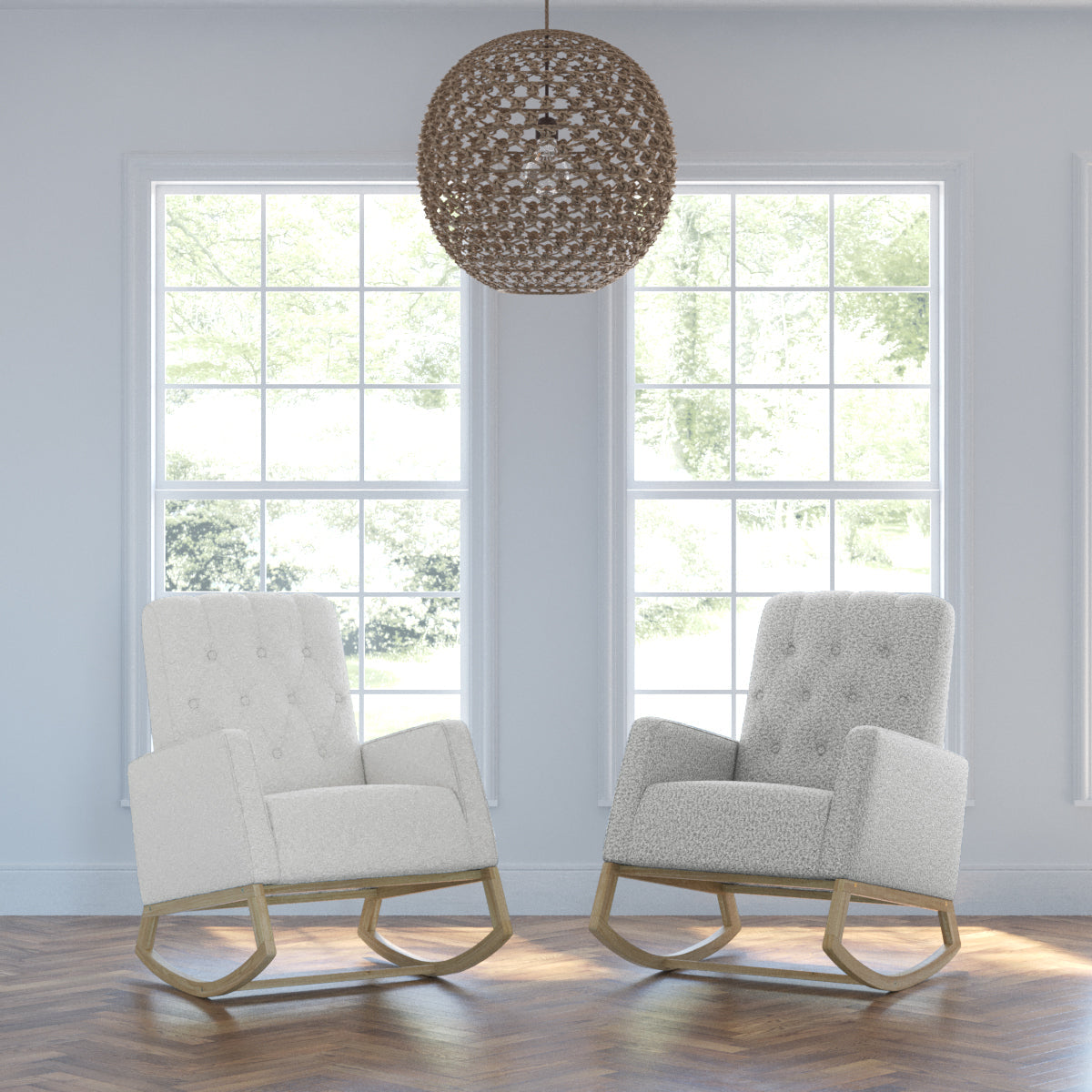 Lights’ upscale, mid-century modern design features a wood rocker base that makes for a gentle motion. It is upholstered in a quilted, button-tufted, soft (yet durable), easy-to-clean polyester fabric.