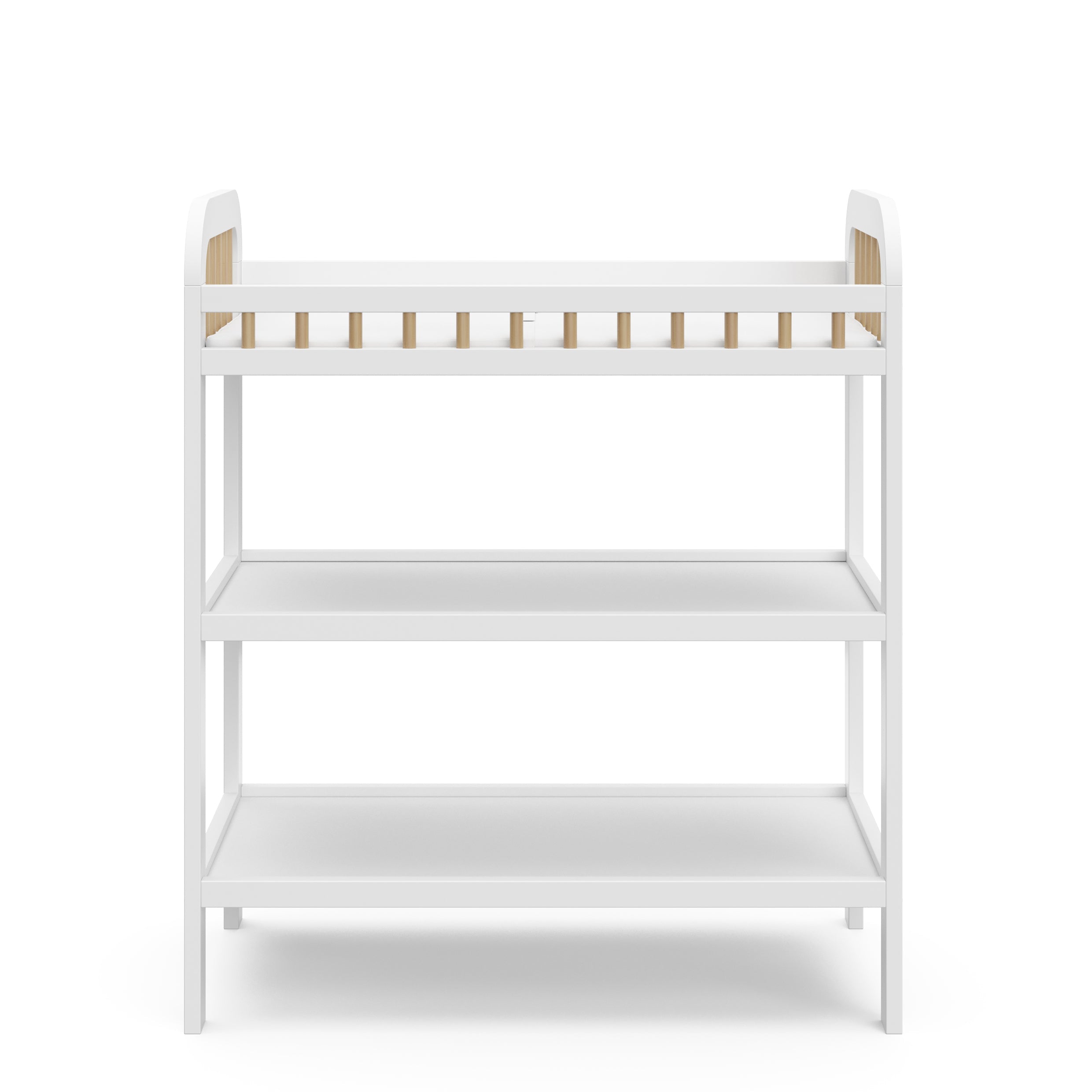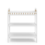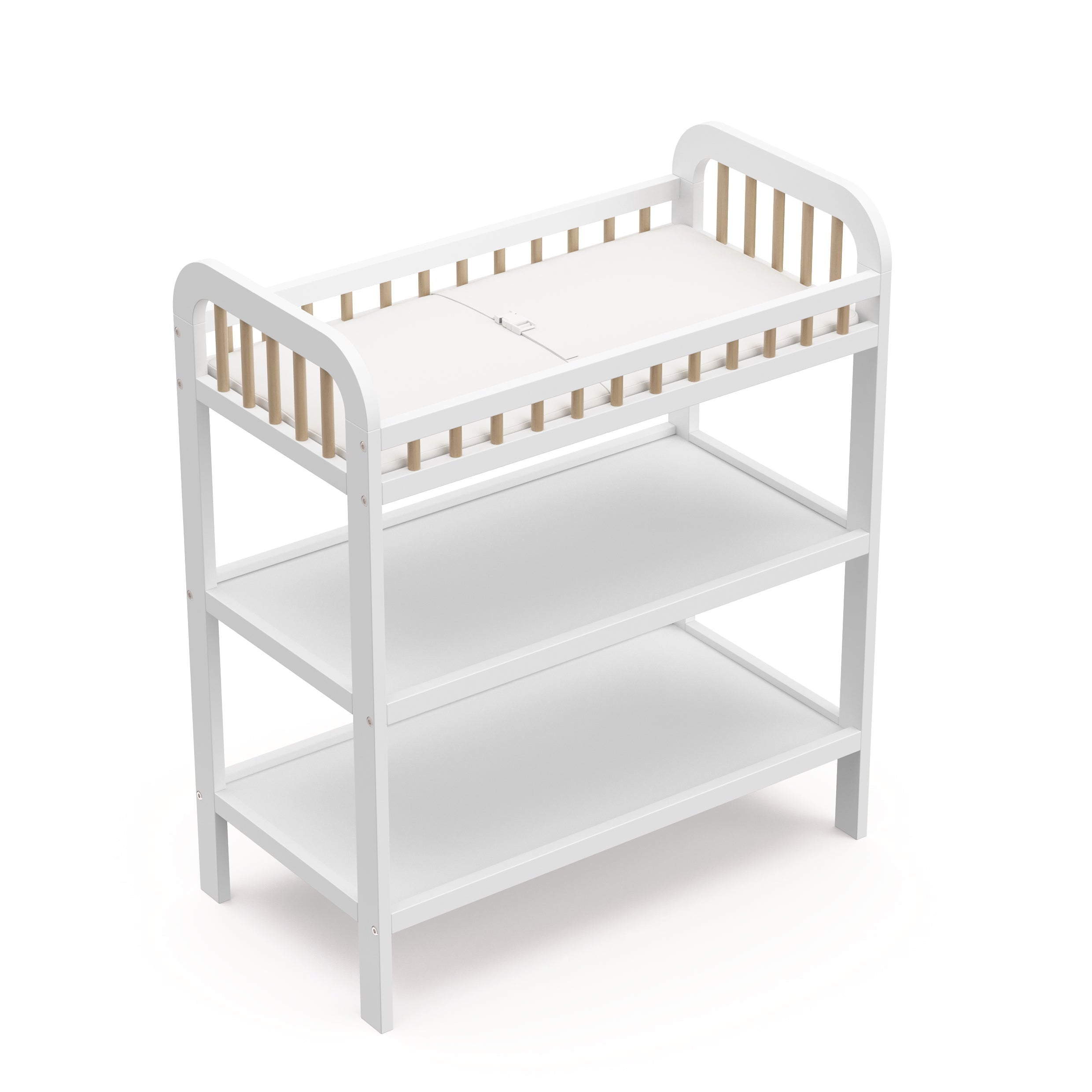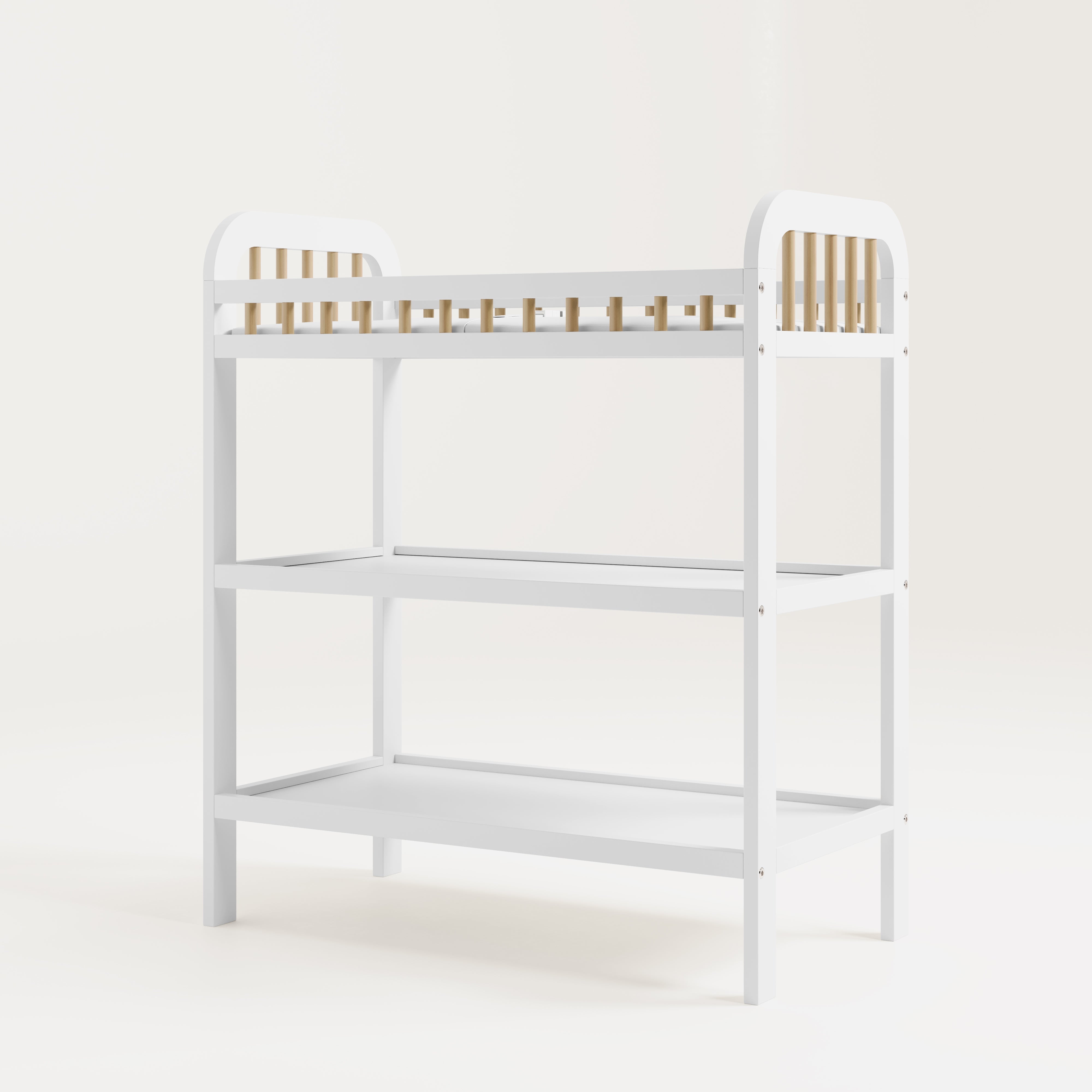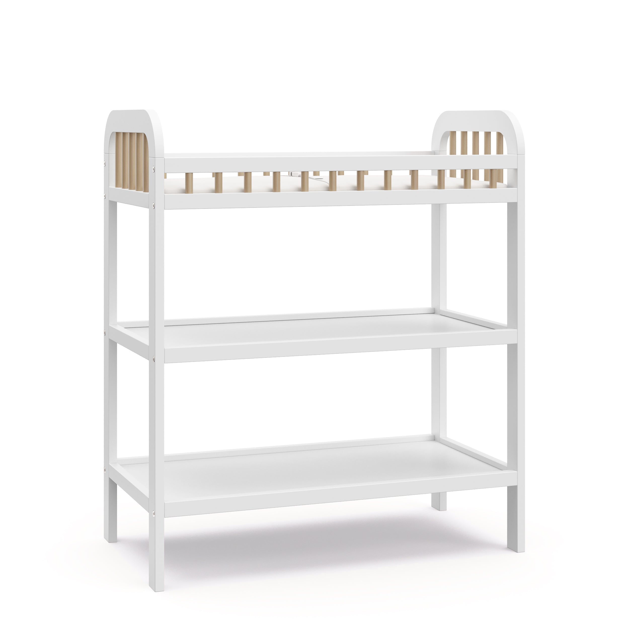 Changing table with storage shelves: Our changing table includes two (2) open storage shelves, allowing you to keep your changing essentials nearby and organized.