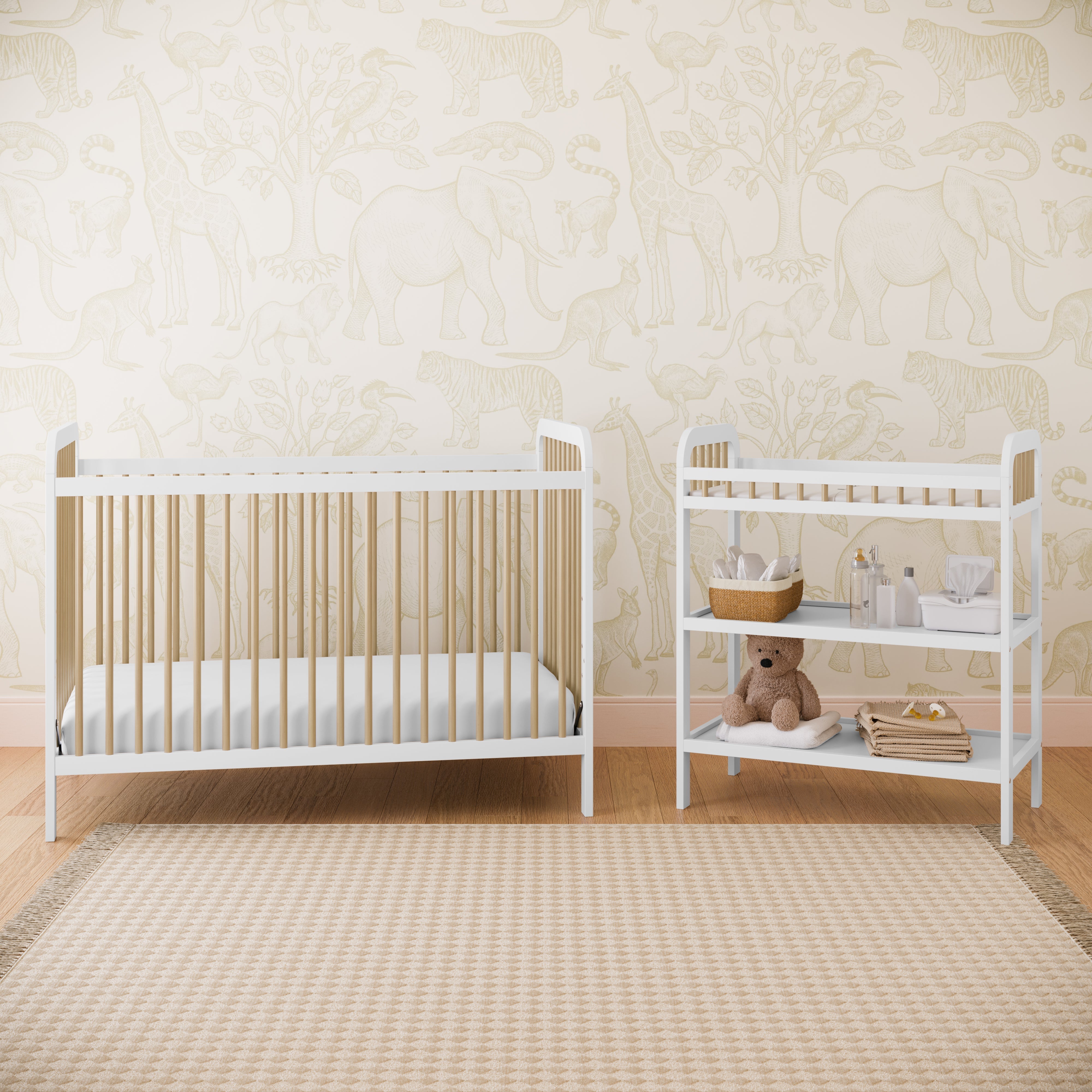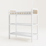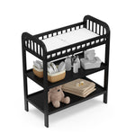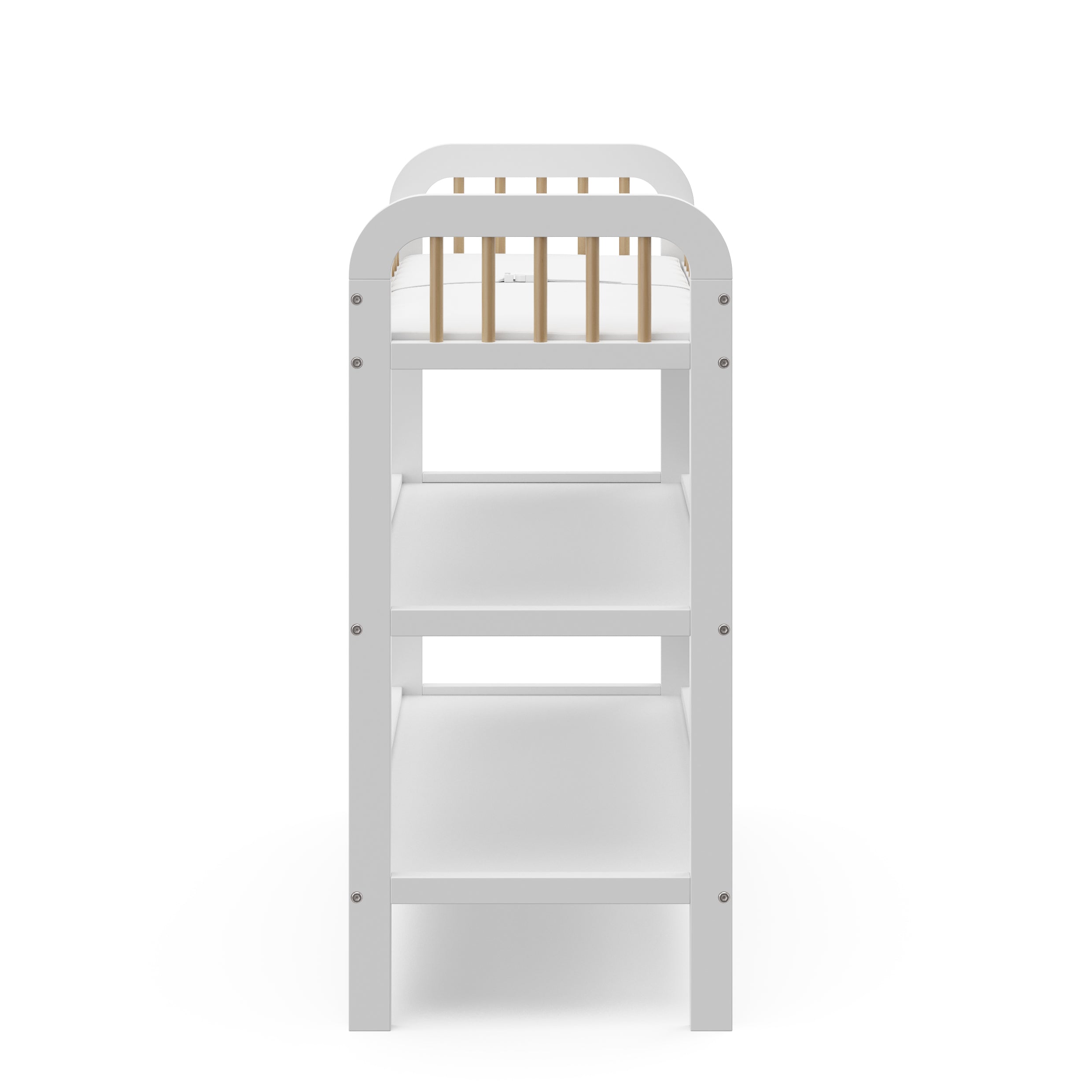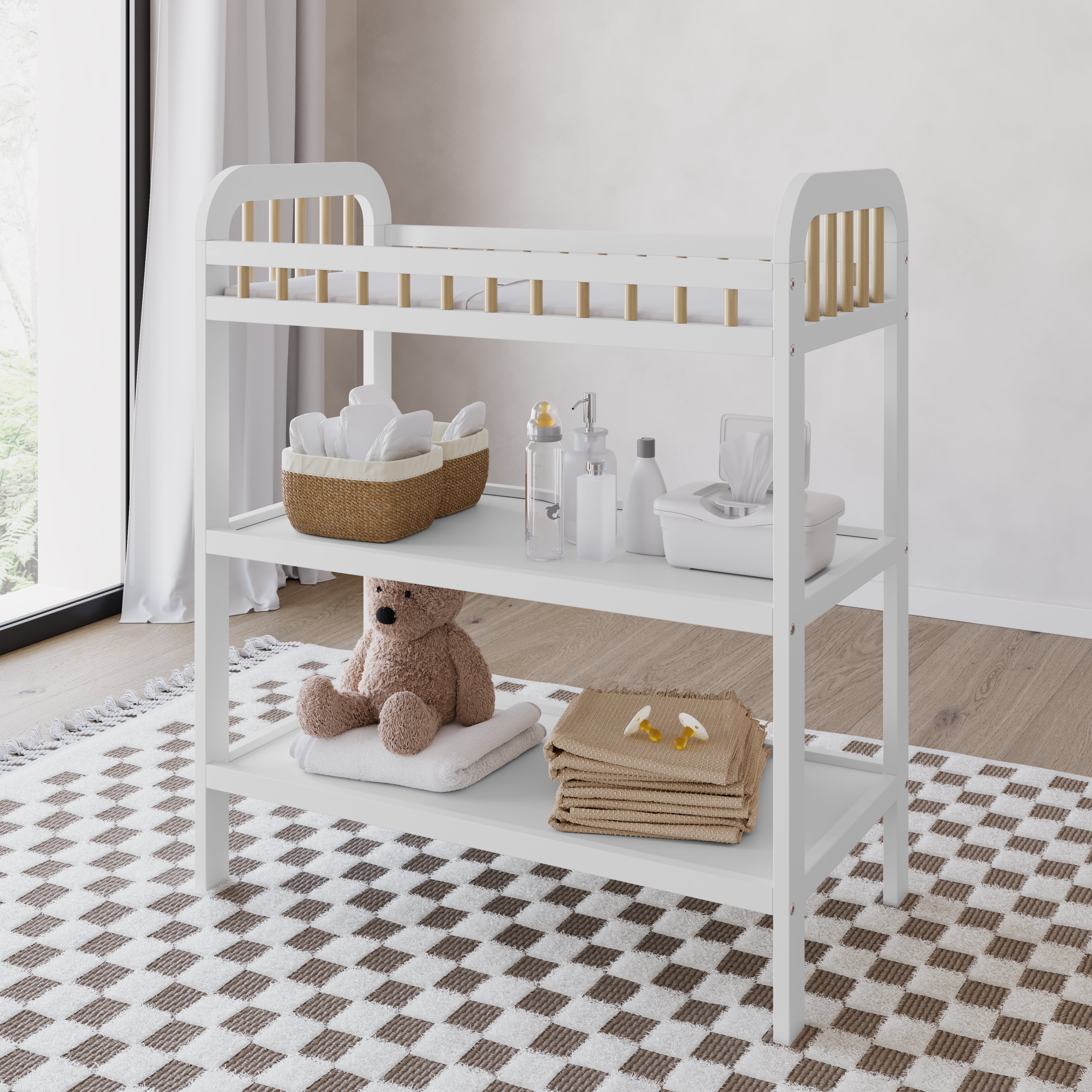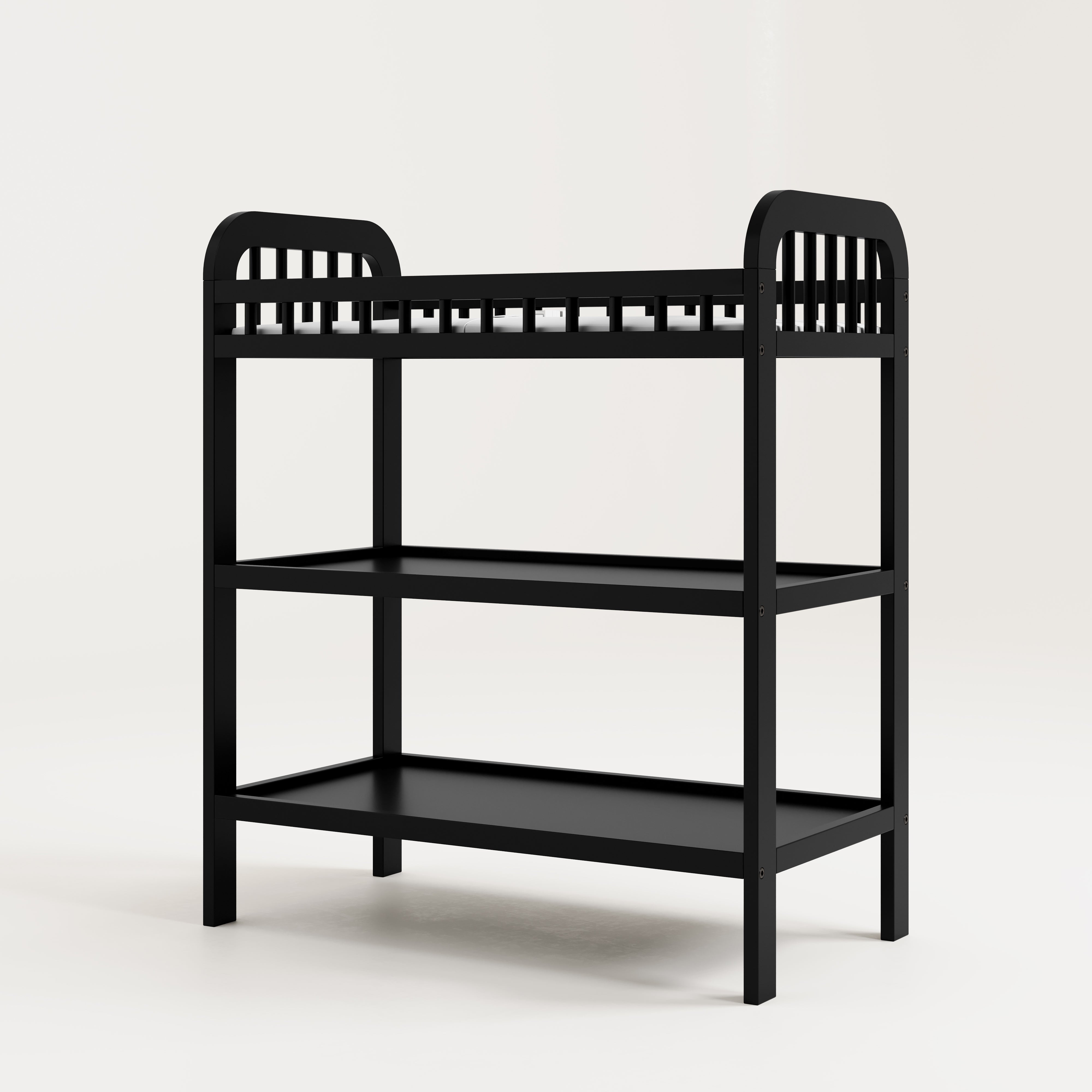 Changing table with storage shelves: Our changing table includes two (2) open storage shelves, allowing you to keep your changing essentials nearby and organized.